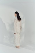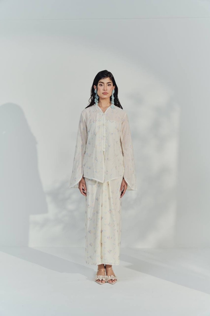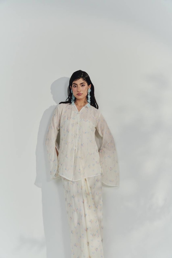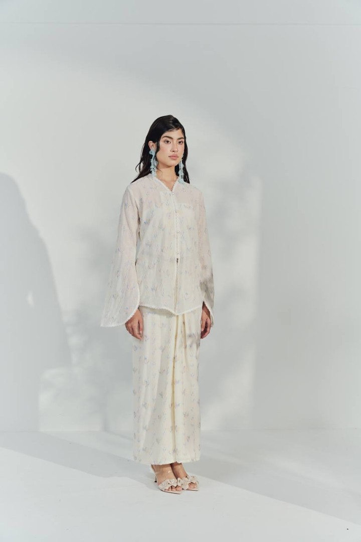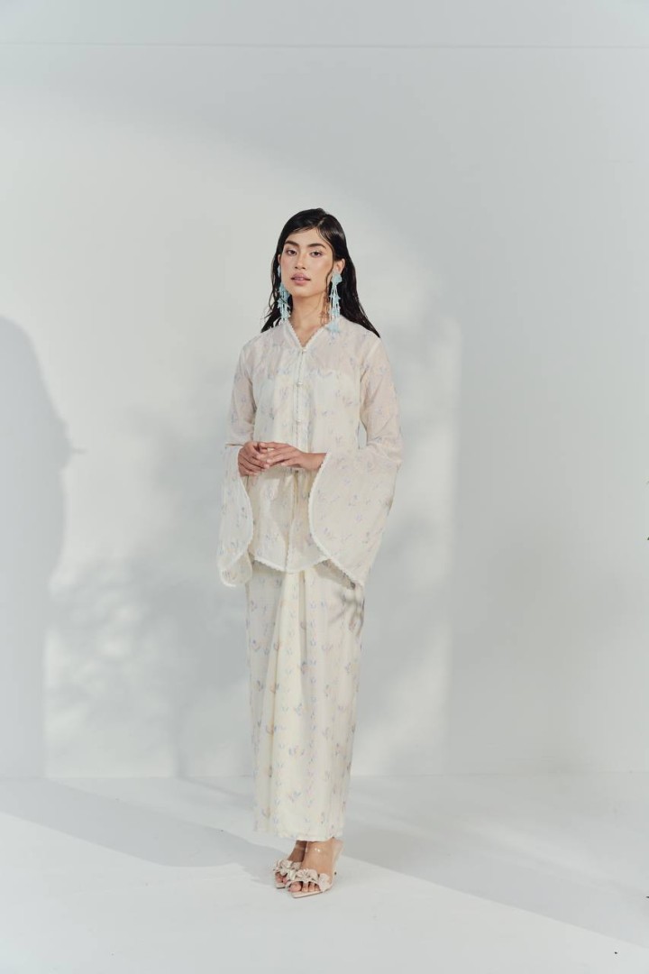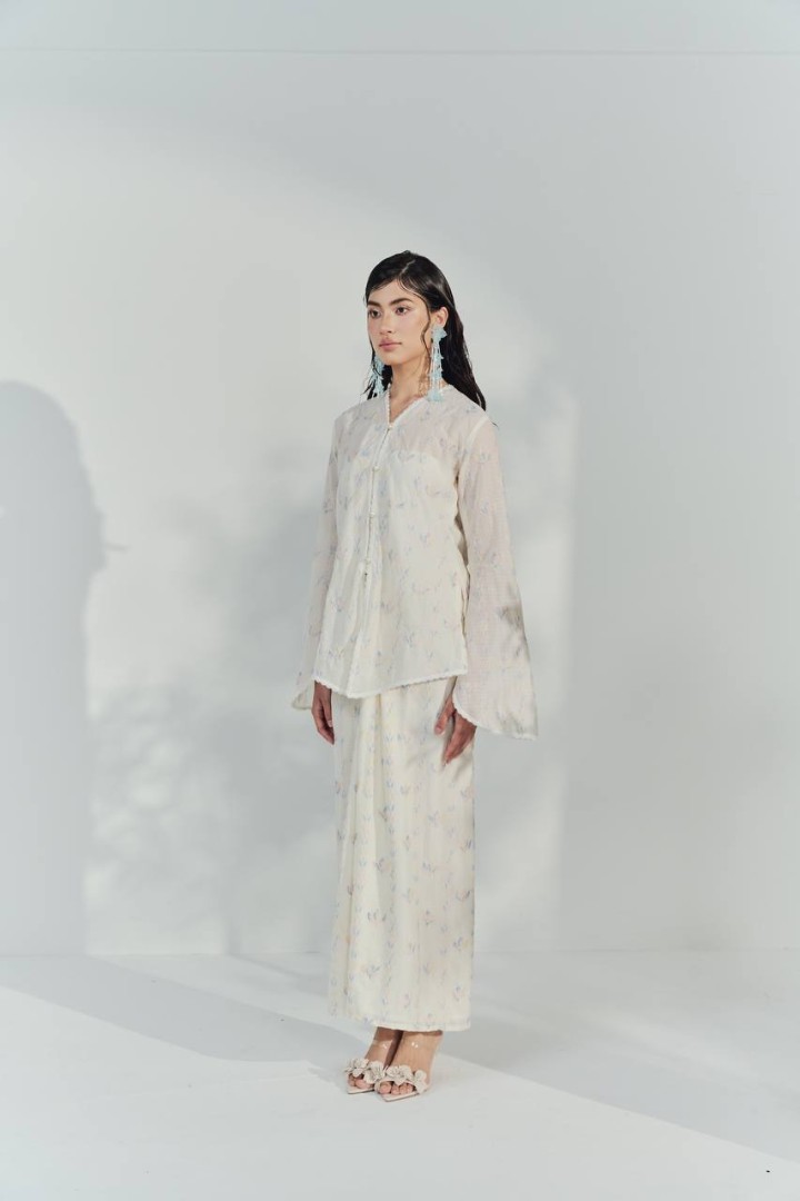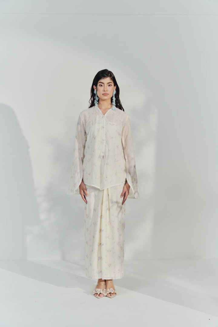 This kebaya top is crafted from a lightweight, semi-sheer fabric in a soft ivory shade, adorned with delicate pastel floral motifs for a fresh and feminine look. The top features a relaxed, flowy silhouette with wide, bell-shaped sleeves that add a touch of elegance and movement. The front is detailed with a row of dainty buttons and subtle lace trim along the neckline, front opening, and sleeve edges, enhancing its romantic appeal. The breathable material and loose fit make it perfect for both formal occasions and comfortable day wear.