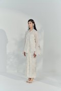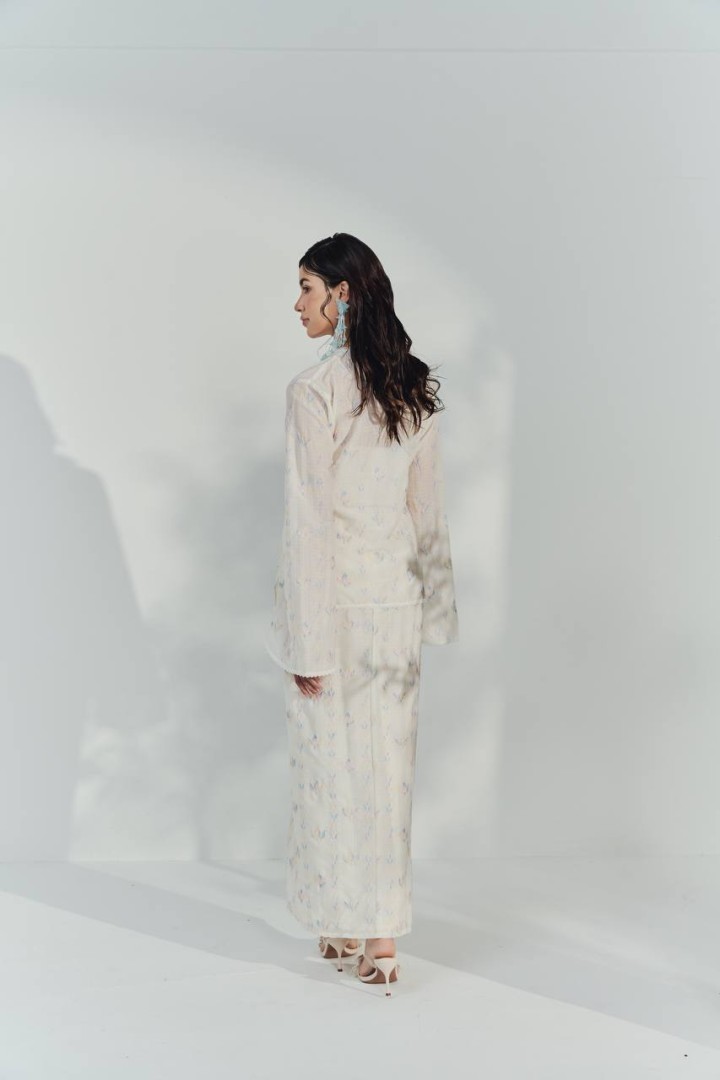 Matching Instant Pario SkirtThe set is completed with a matching skirt, designed in the same soft ivory fabric with pastel floral prints. Its simple yet elegant design allows for easy movement while maintaining a polished, traditional look. The coordinated pattern creates a harmonious ensemble, perfect for festive events, family gatherings, or as a chic addition to your modern kebaya collection.